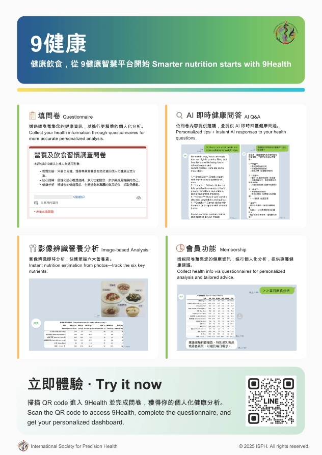 三、為落實章程所定任務,並促進精準健康科技於高等教育、研究及實務場域之應用,本會特別邀請各大專校院、相關學術學會及研究機構,共同參與「9Health 智慧健康 LINE App」平台之試用與推廣,作為精準健康教育、研究及健康促進之輔助工具。(詳細操作請參見官網: www.isfph.org)。